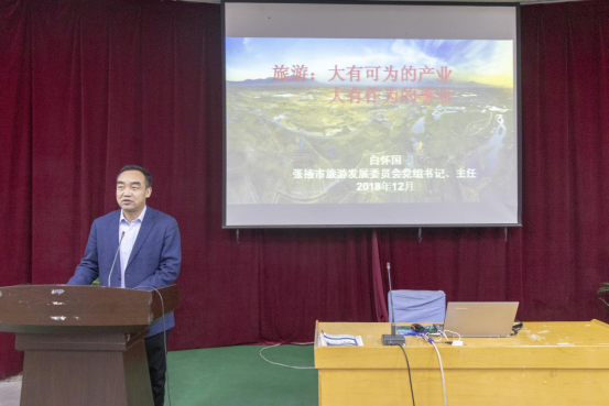 白怀国主任从近六年张掖的旅游收入、接待状况等方面分析了张掖旅游业发展现状,阐述了张掖旅游发展的四大行动:旅游大景区建设行动,旅游全产业链打造行动,旅游管理服务水平提升行动以及文化旅游全民宣传行动。并在当前工作的基础上,提出了发展张掖旅游,就是要在今后打造中国自驾游和户外运动大本营,建设国际化旅游目的地和中国西部旅游集散中心的工作思路。