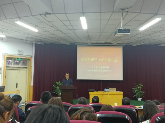 报告会上,安玉军、刘森垚等五位老师分别作了题为《裕固族生态文化研究》、《胡汉墓志所见唐初降服陇右的进程》、《古希腊神话中女神形象探源—从爱琴文明到古风时代》、《基于网络差评的张掖市酒店服务质量提升对策》、《我国西北内陆城市居民邮轮旅游障碍因素研究:张掖城市居民的实证》的报告。他们根据自己的研究专长,和师生们分享了自己的论文研究成果。报告内容从历史学、旅游和酒店等方面展开,研究角度新颖,内容丰富多彩,从各方面阐述了报告内容,对师生颇具启发。