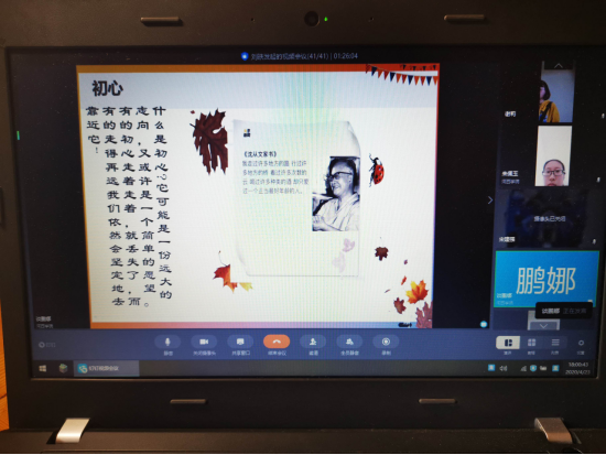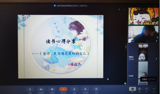 通过钉钉网络视频,学生党员韩瑞、白占强、李蕴杰、党周生、谈鹏娜5位同学结合平时的读书体会,分别同与会人员分享了《人一生要读的经典》、《治史三书》、《努力,是为遇见更好的自己》、《平凡的世界》和《活着》五部作品。在音乐、PPT画面和诗文中,同学们讲述着自己读书的心得和感受,讲述着在读书中的获得的乐趣和享受,同时也认识到读书的重要性和必要性。此次活动中,同学们所分享的书目以不同的体裁、方式和风格表达了同一个观点,那就是通过读书不断地努力去遇见更好的自己!