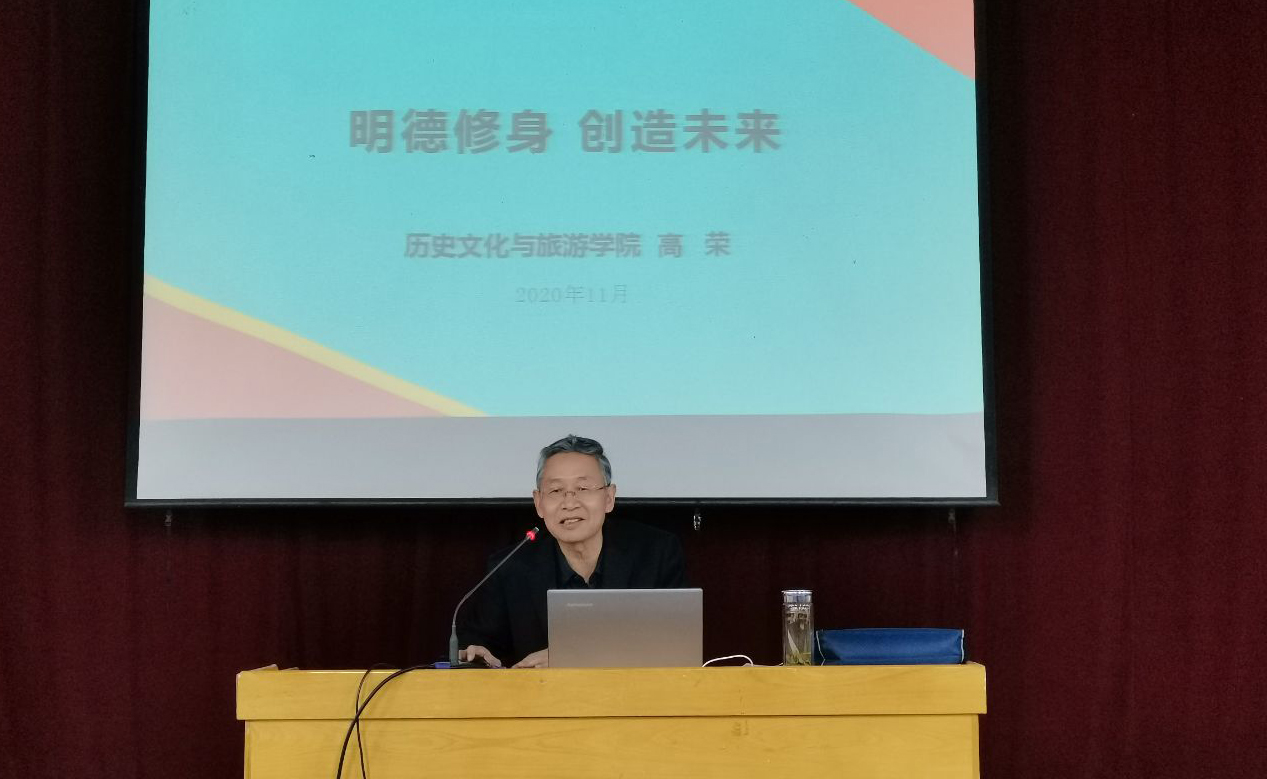 高荣教授结合多年的从教、治学经历,从大学的根本任务、大学生应该如何安排自己的生活与学业、大学生应该如何创造美好的未来等方面,同与会师生分享了自己的经验,并结合历史学、旅游管理、酒店管理等专业特色,对大学生提出了中肯的建议。高荣认为,当代大学生应该学会学习、学会做人、学会做事,要敢于担当和超越,要明礼诚信,要乐观豁达,形成健全的人格、健康的心灵和健康的体魄,在此基础上,才会创造属于自己的成功的美好未来。
