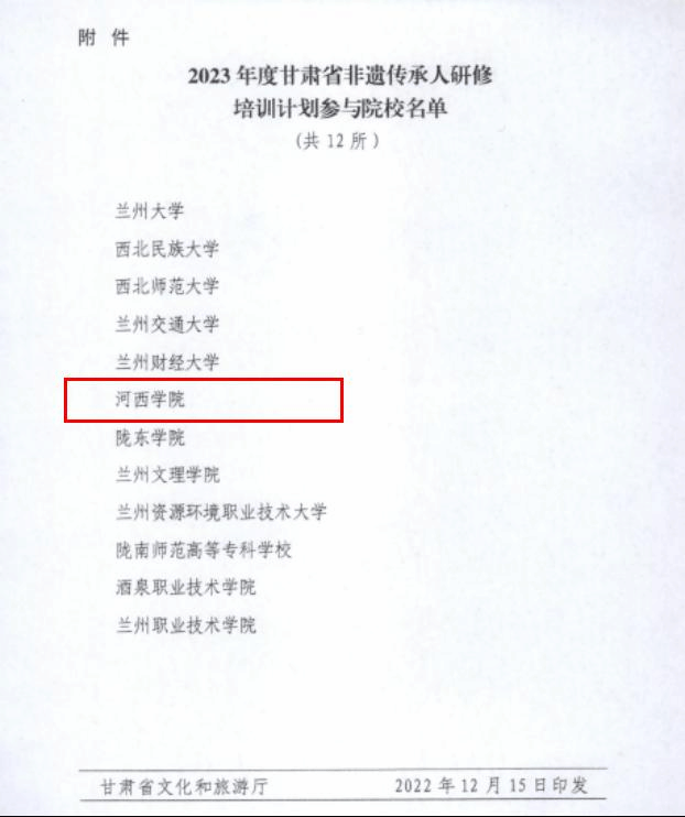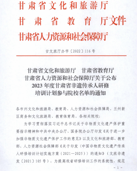 2022年12月15日,甘肃省文化和旅游厅、甘肃省教育厅、甘肃省人力资源和社会保障厅下发《关于公布2023年度甘肃省非遗传承人研修培训计划参与院校名单的通知》,根据通知精神,星空XK入选2023年度甘肃省非遗传承人研修培训计划参与院校。