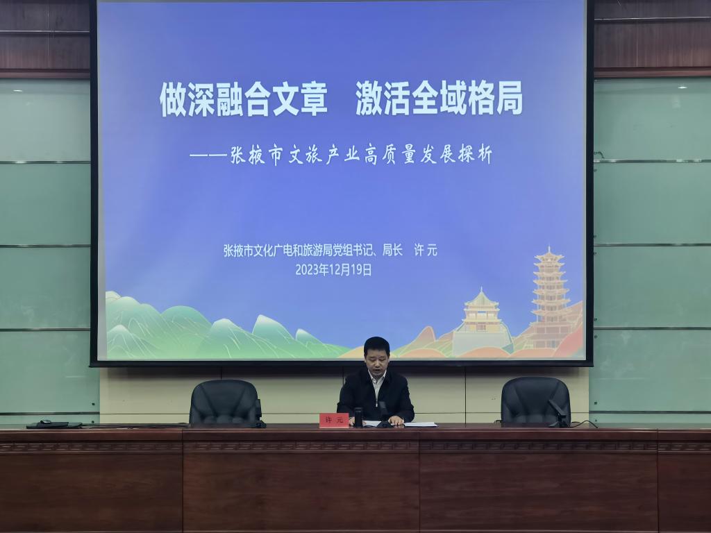 许元局长以文化和旅游融合发展为起点,从“俯瞰河西走廊,在千年丝路中品读张掖魅力”“找准短板弱项,在正视差距中把握大局大势”“强化学思践悟”在担当作为中实现高质量发展”三个方面系统阐述了河西走廊与张掖悠久的历史与文化,回顾了张掖市文旅产业发展历程,并提出张掖文旅产业发展过程存在着“旅游人次多、人均消费少”“旅游资源多、文创产品少”“观光旅游多、沉浸体验少”“景区景点多、全域统筹少”“从业人员多、专业人才少”“全员宣传多,精准营销少”的“六多六少”特征,最后结合张掖文化旅游发展趋势指出了强化政治担当、传承弘扬张掖优秀传统文化,坚持文化惠民、推动张掖文化大发展大繁荣,发展全域旅游、做强张掖文化旅游首位产业,系统宣传营销、打造世界级旅游目的地品牌的张掖文旅产业高质量发展策略。